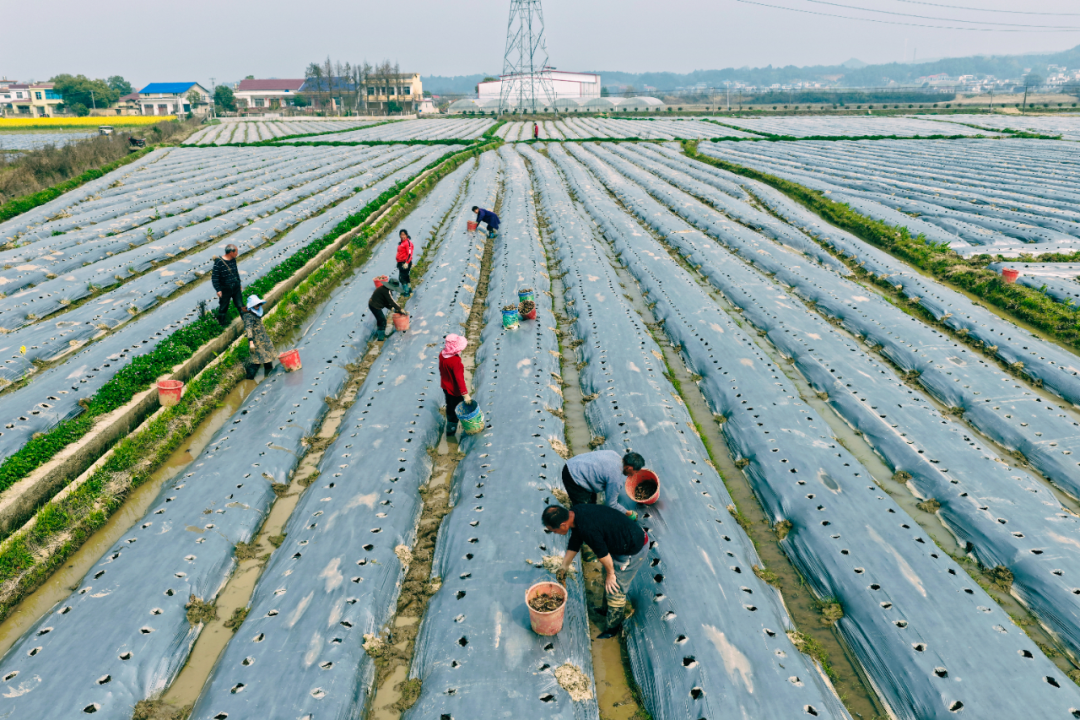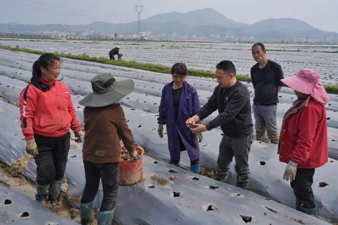 風(fēng)和煦,新綠遍野。基地里,村民們兩三人一組默契配合,動作嫻熟,將飽滿芋種芽點(diǎn)朝上精準(zhǔn)點(diǎn)入土中。“株距要留兩拳寬,覆土不能壓太實,這樣芋頭才能長得又大又勻稱!”種植大戶姜太勝一邊示范一邊為農(nóng)戶講解育種技巧。陽光下,村民們彎腰勞作的身影與縱橫交錯的田埂相映成趣,繪就一幅質(zhì)樸動人的春耕圖。