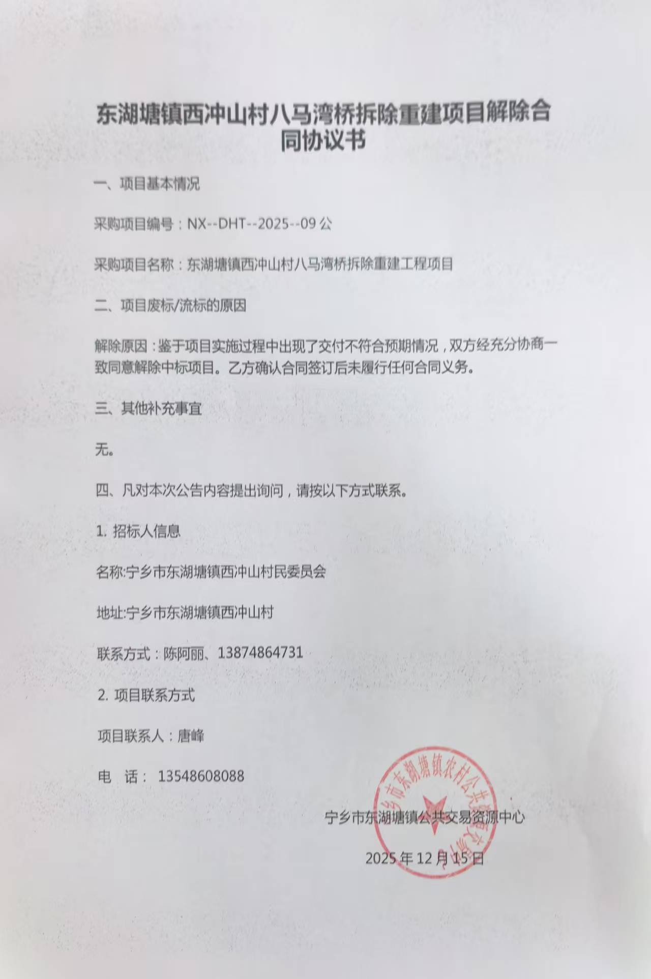 東湖塘鎮西沖山村八馬灣橋拆除重建項目解除合同協議書