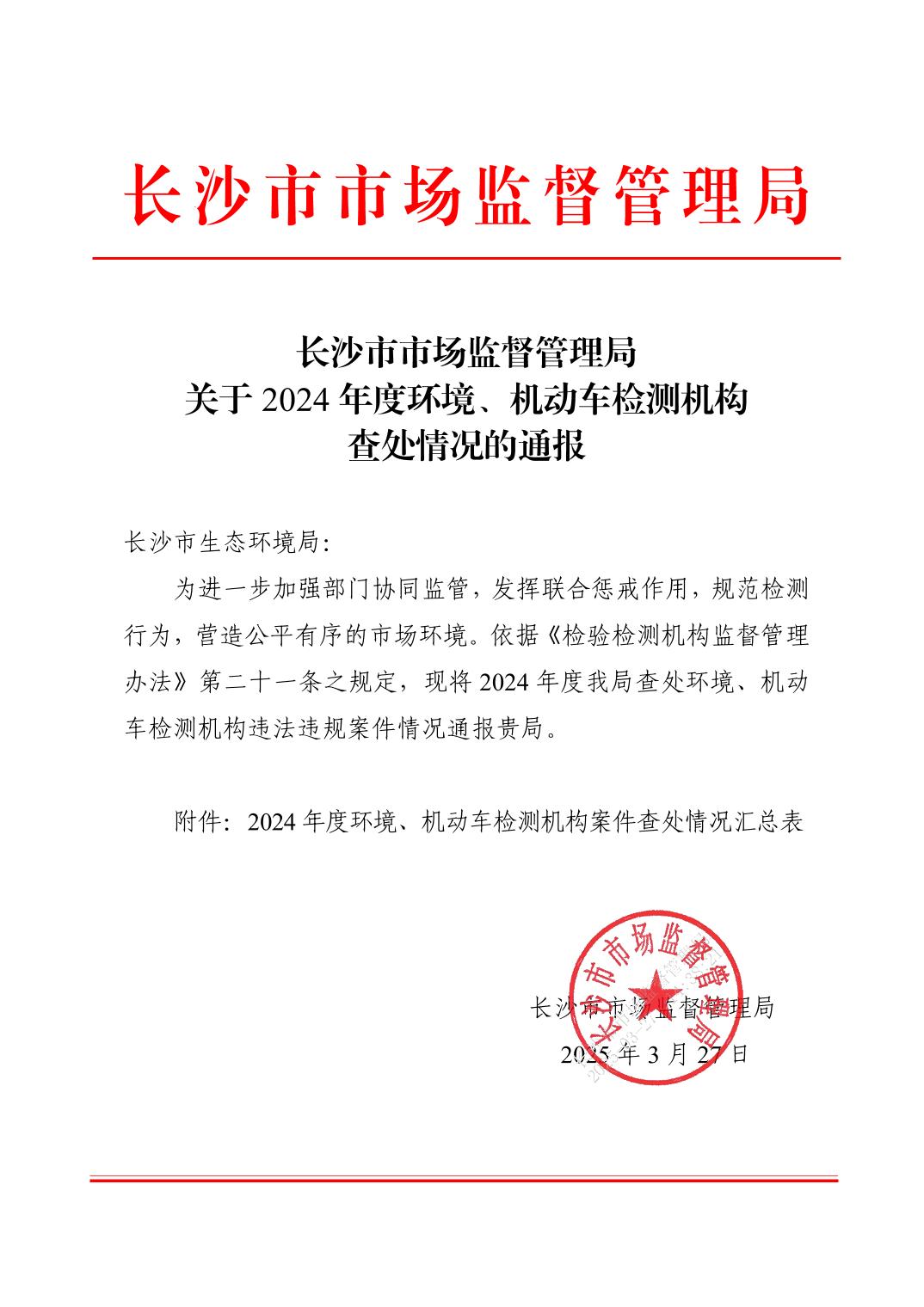 長沙市市場監督管理局關于2024年度環境、機動車檢測機構查處情況的通報