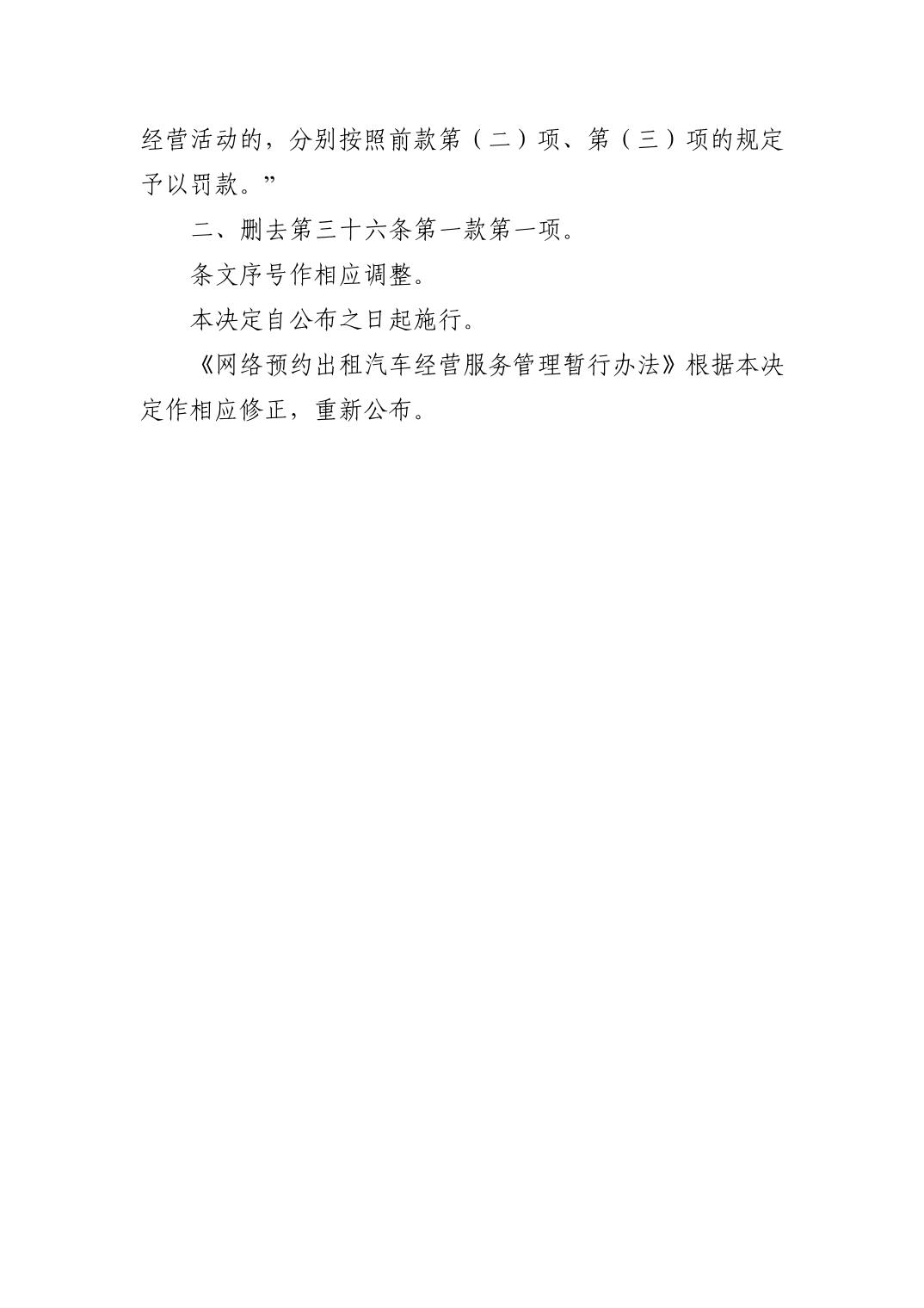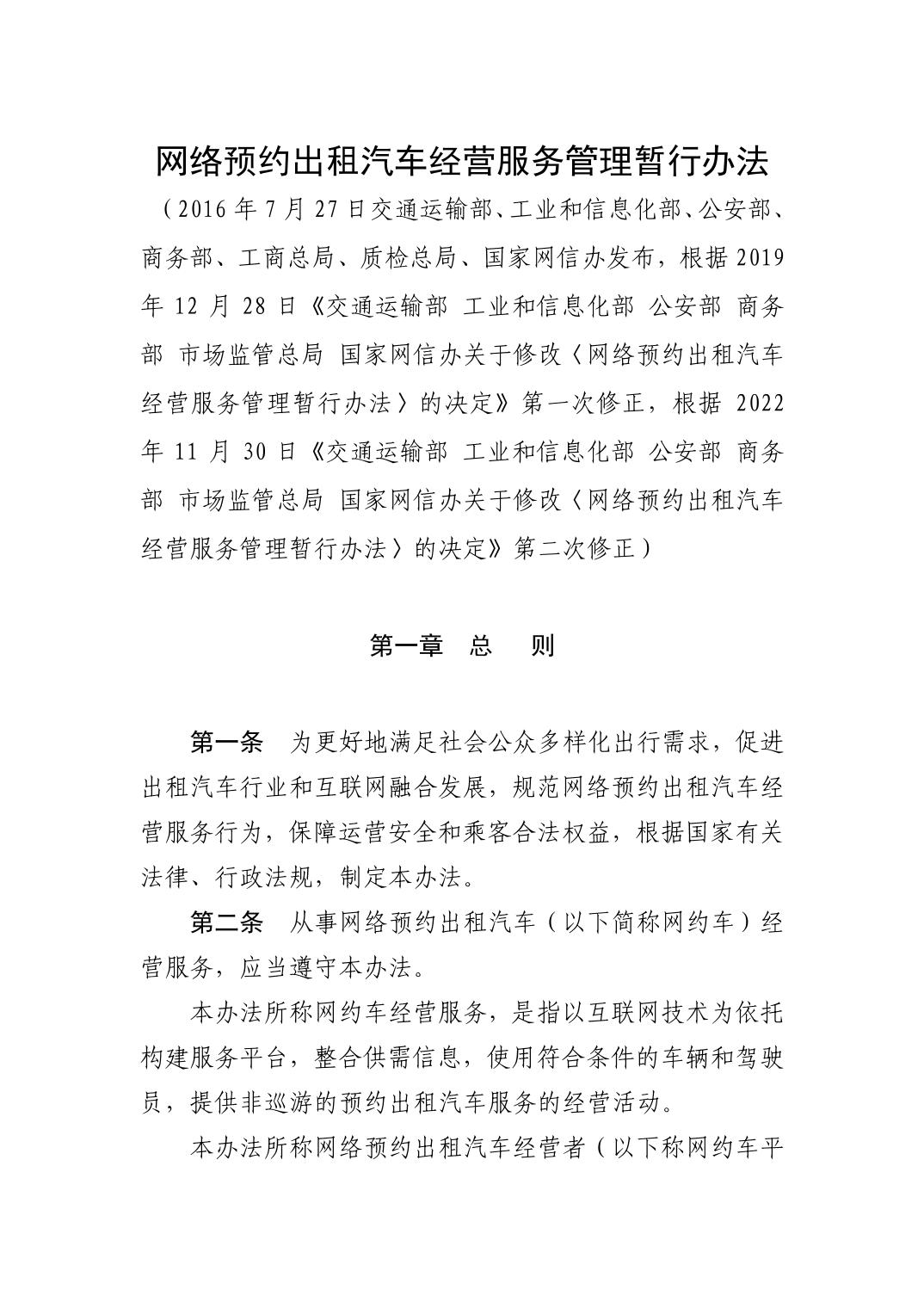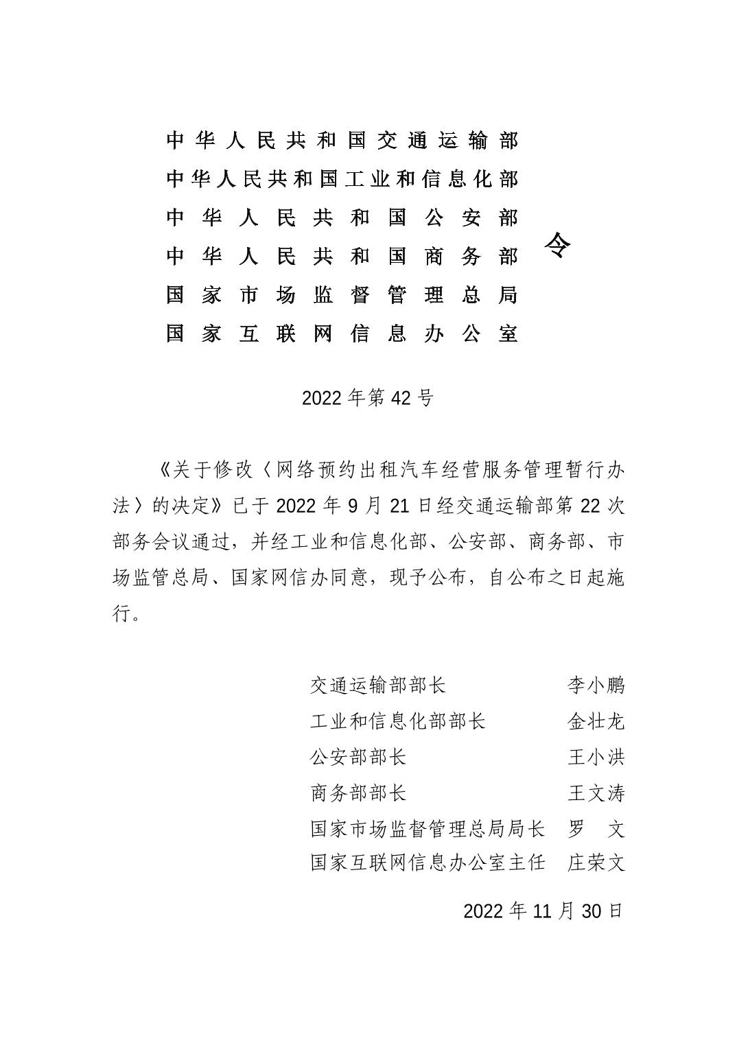 交通運輸部 工業和信息化部 公安部 商務部 市場監管總局 國家網信辦 關于修改《網絡預約出租汽車經營服務管理暫行辦法》的 決定