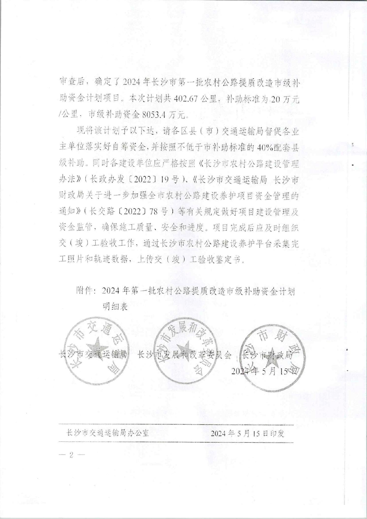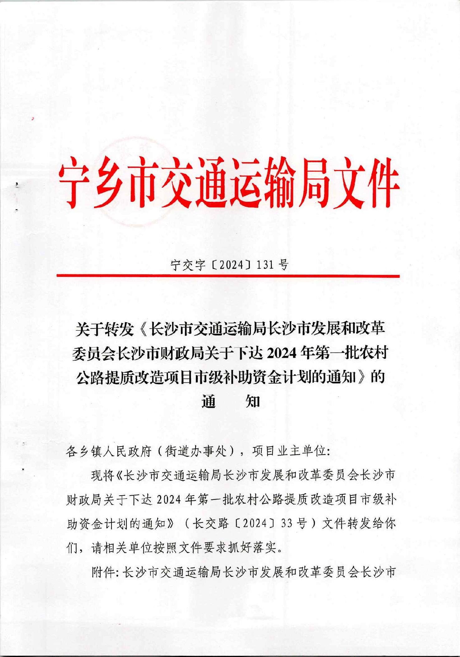 關于轉發《長沙市交通運輸局長沙市發展和改革委員會長沙市財政局關于下達2024年第一批農村公路提質改造項目市級補助資金計劃的通知》的通知