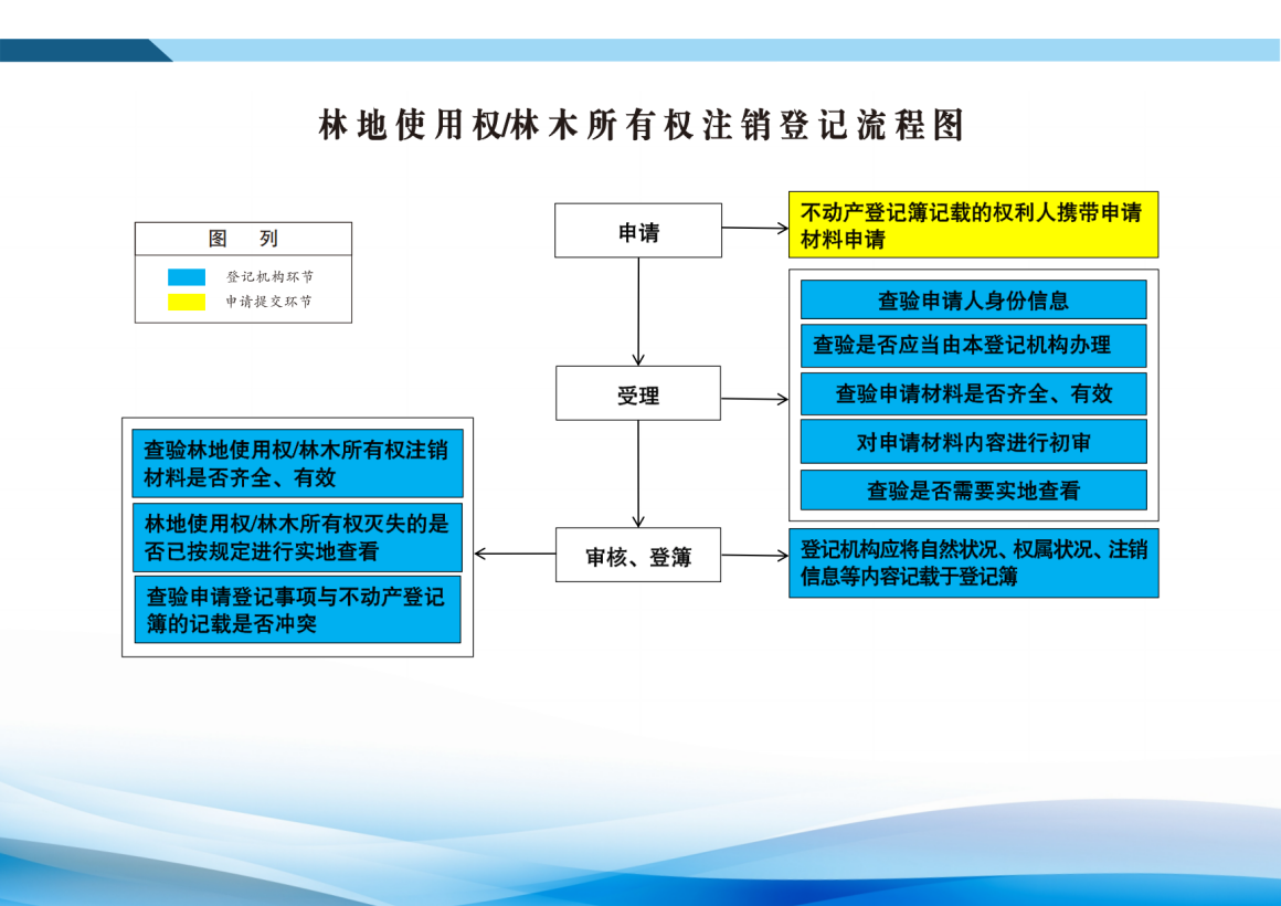 1)不動產滅失的,提交證實滅失的材料(2)林地全部被依法轉為建設用地等非林地的,提交證實林地全部被依法轉為建設用地等非林地的材料;(3)權利人放棄不動產權利的,提交權利人放棄不動產權利的書面材料。設有地役權或者已經辦理查封登記的,需提交地役權人或者查封機關同意注銷的書面材料。不動產被依法收回或者權利人依法、自愿交回的,提交相關材料;(4)不動產被依法征收的,提交縣級以上人民政府生效的征收決定書;(5)權利人死亡且無繼承人的,提交權利人死亡的相關材料;(6)人民法院或者仲裁機構生效法律文書導致不動產權利消滅的,提交人民法院或者仲裁機構的生效法律文書。[共享件或原件]