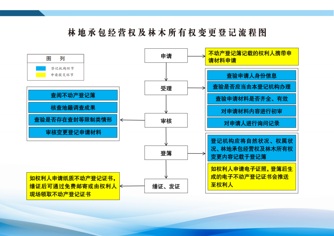 按情形提交以下變更材料,包括:(1)權(quán)利人姓名、身份證明類型或者身份證明號碼發(fā)生變化的,提交能夠證實其身份變更的材料以及變更后的林地承包經(jīng)營權(quán)合同(2)家庭成員發(fā)生變化的,提交能夠證實家庭成員發(fā)生變化的材料以及變更后的林地承包經(jīng)營權(quán)合同(3)不動產(chǎn)的坐落、名稱等發(fā)生變化的,提交能夠證實坐落、名稱變更的材料以及變更后的林地承包經(jīng)營權(quán)合同(4)林地面積、界址范圍發(fā)生變化的,提交能夠證實林地面積、界址范圍發(fā)生變更的材料,地籍 調(diào)查表、宗地圖、宗地界址點坐標等地籍調(diào)查成果以及變更后的林地承包經(jīng)營權(quán)合同(5)林地用途部分發(fā)生變化的,提交導(dǎo)致林地用途發(fā)生變化的材料以及變更后的林地承包經(jīng)營權(quán)合同(6)承包期限發(fā)生變化的,提交調(diào)整后的林地承包經(jīng)營權(quán)合同(7)承包期限屆滿后繼續(xù)承包的,提交發(fā)包方與承包方重新簽訂的林地承包經(jīng)營權(quán)合同;(8)森林類別發(fā)生變化的,提交林業(yè)主管部門審批同意變化的文件以及變更后的林地承包經(jīng)營權(quán)合同;主要樹種等發(fā)生變化的,提交證實發(fā)生變化的材料以及變更后的林地承包經(jīng)營權(quán)合同(9)同一權(quán)利人分割或者合并不動產(chǎn)的,提交變更后的林地承包經(jīng)營權(quán)合同,以及變更后的地籍調(diào)查表、宗地圖以及宗地界址點坐標等地籍調(diào)查成果(10)在已登記的無林地上更新造林申請變更登記的,提供能夠證實更新造林的材料以及變更后的林地承包經(jīng)營權(quán)合同[共享件或原件] | |
