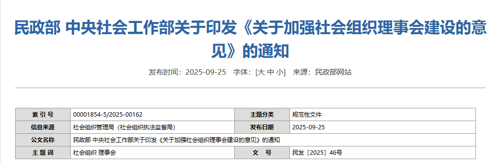 民政部 中央社會工作部關(guān)于印發(fā)《關(guān)于加強社會組織理事會建設(shè)的意見》的通知