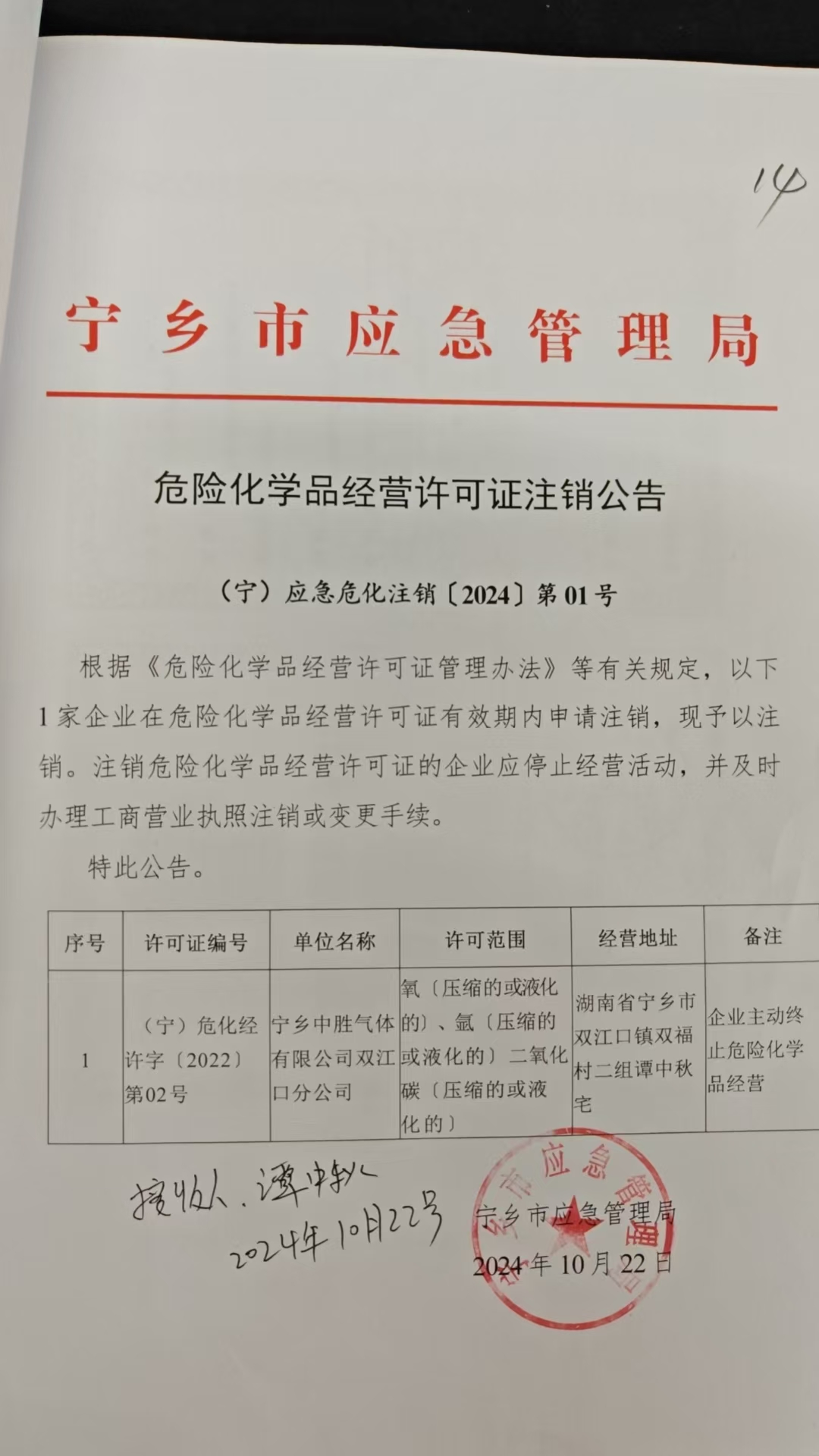 寧鄉中勝氣體有限公司雙江口分公司危險化學品經營許可證注銷公告