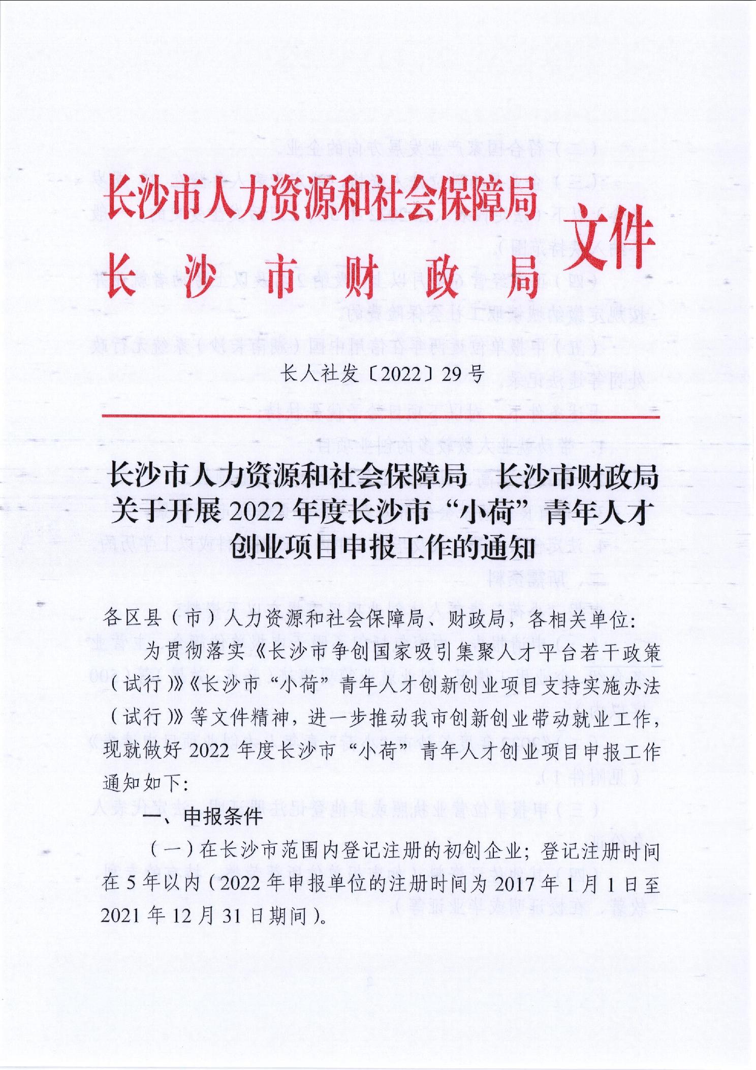 關于開展2022年度長沙市“小荷”青年人才創業項目申報工作的通知