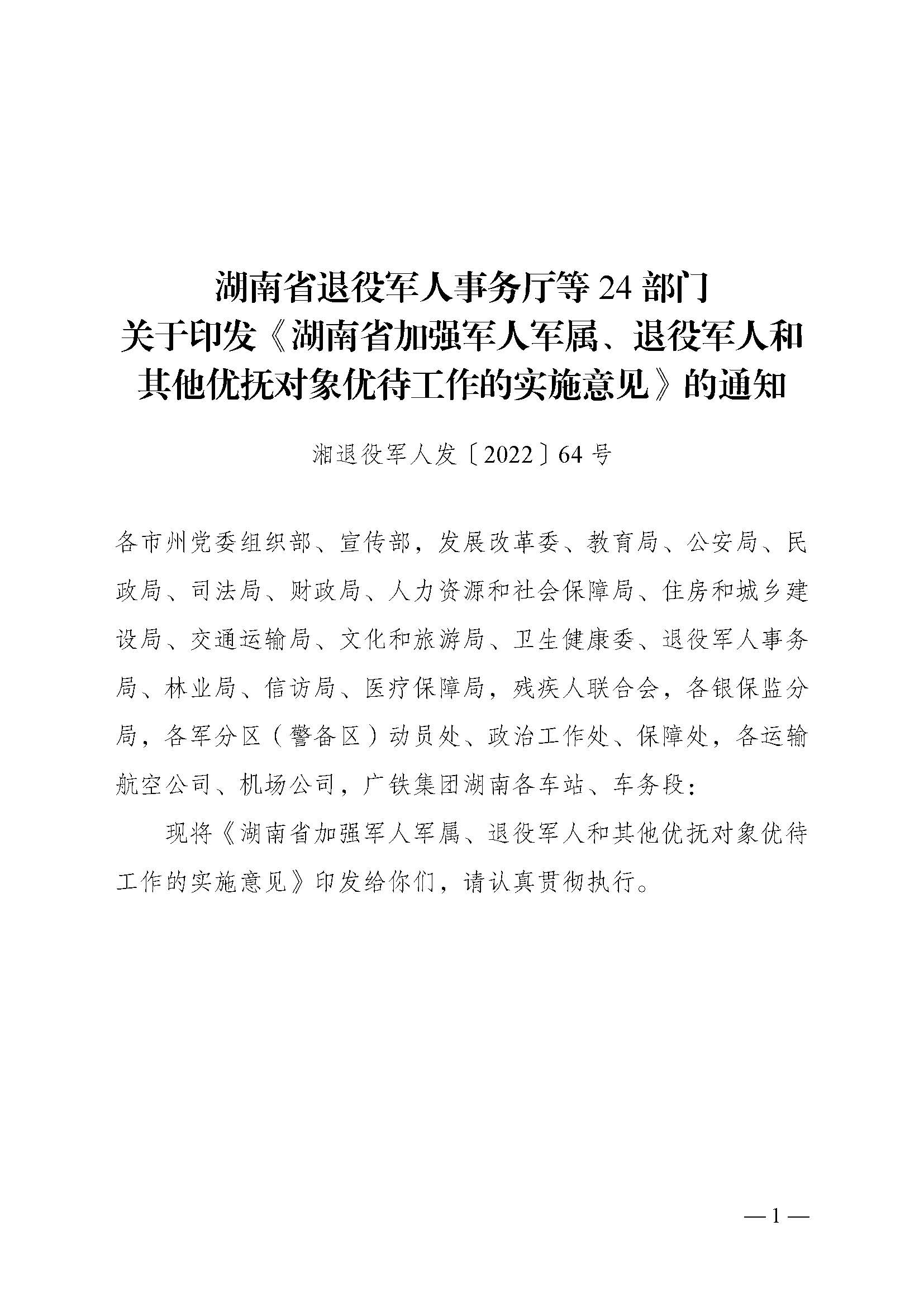 湖南省退役軍人事務廳等24部門關于印發《湖南省加強軍人軍屬、退役軍人和其他優撫對象優待工作的實施意見》的通知