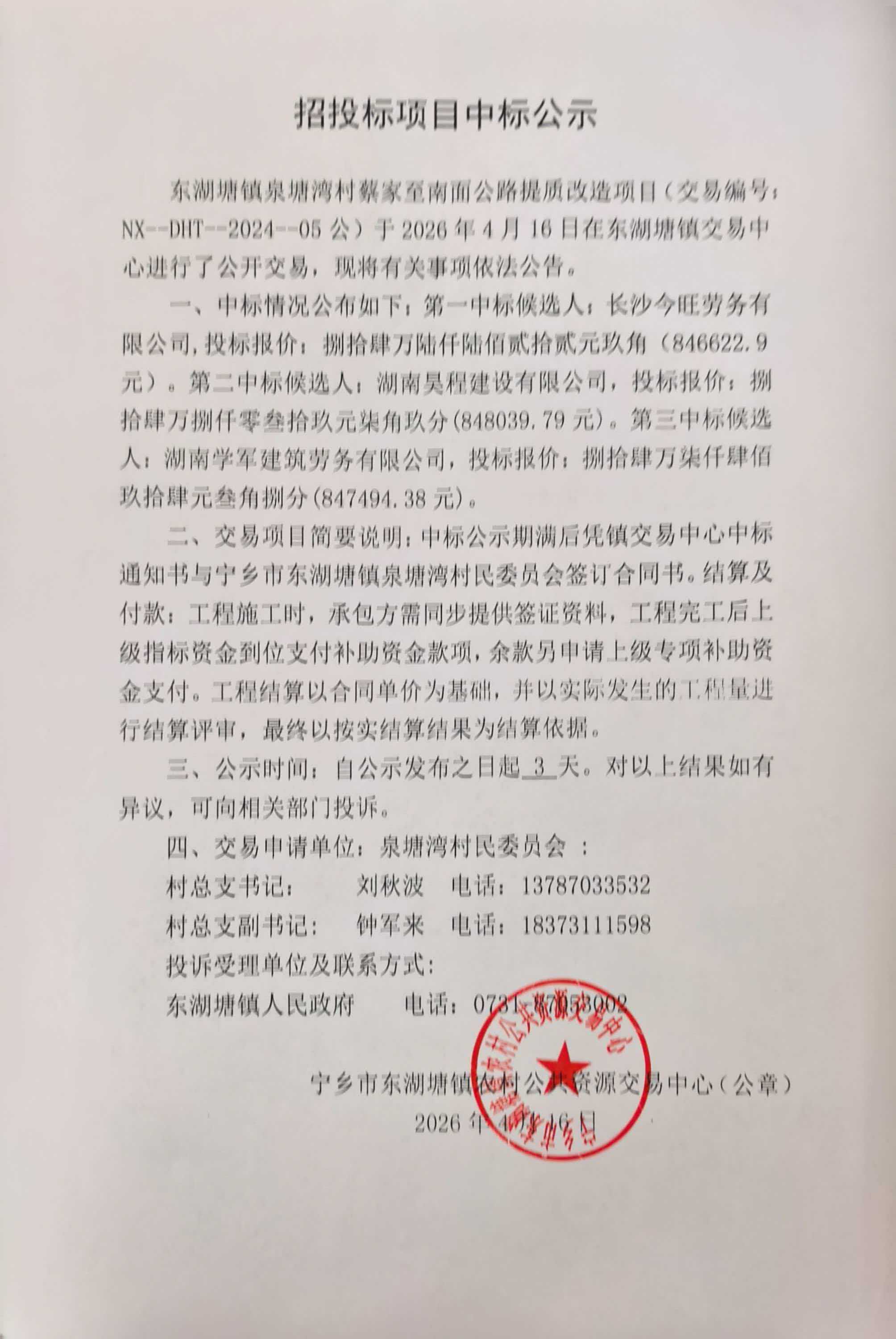 寧鄉市東湖塘鎮泉塘灣村蔡家至南面公路提質改造項目中標公示