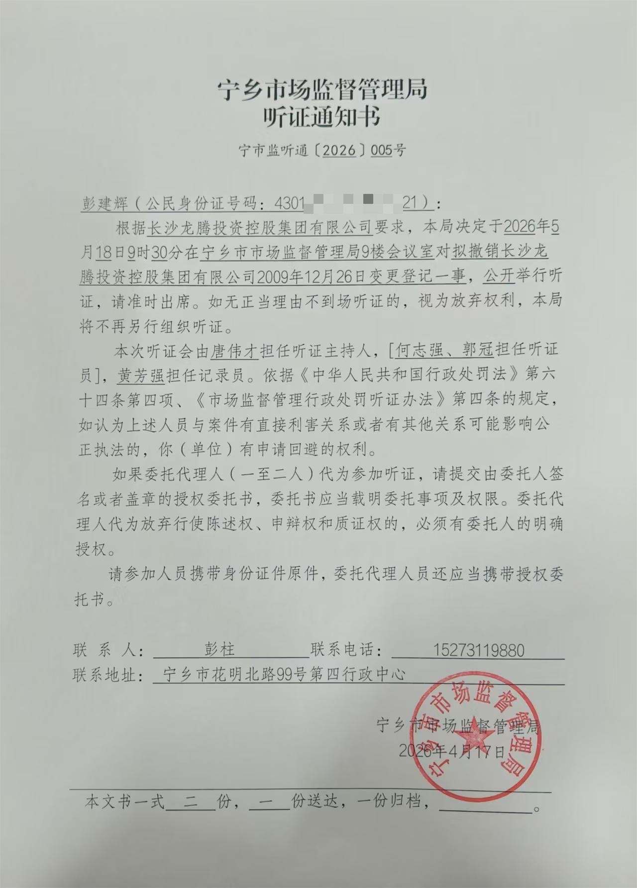 根據長沙龍騰投資控股集團有限公司要求,本局決定于2026年5月18日9時30分在寧鄉市市場監督管理局9樓會議室對擬撤銷長沙龍騰投資控股集團有限公司2009年12月26日變更登記一事,公開舉行聽證,請準時出席。如無正當理由不到場聽證的,視為放棄權利,本局將不再另行組織聽證。