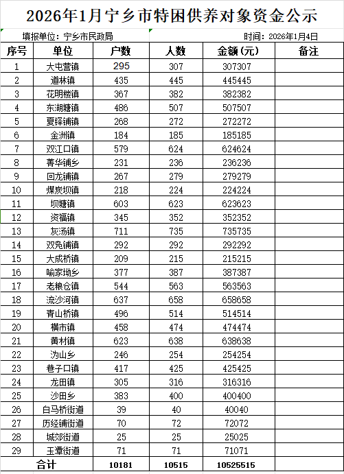 2026年1月寧鄉市特困供養對象資金公示