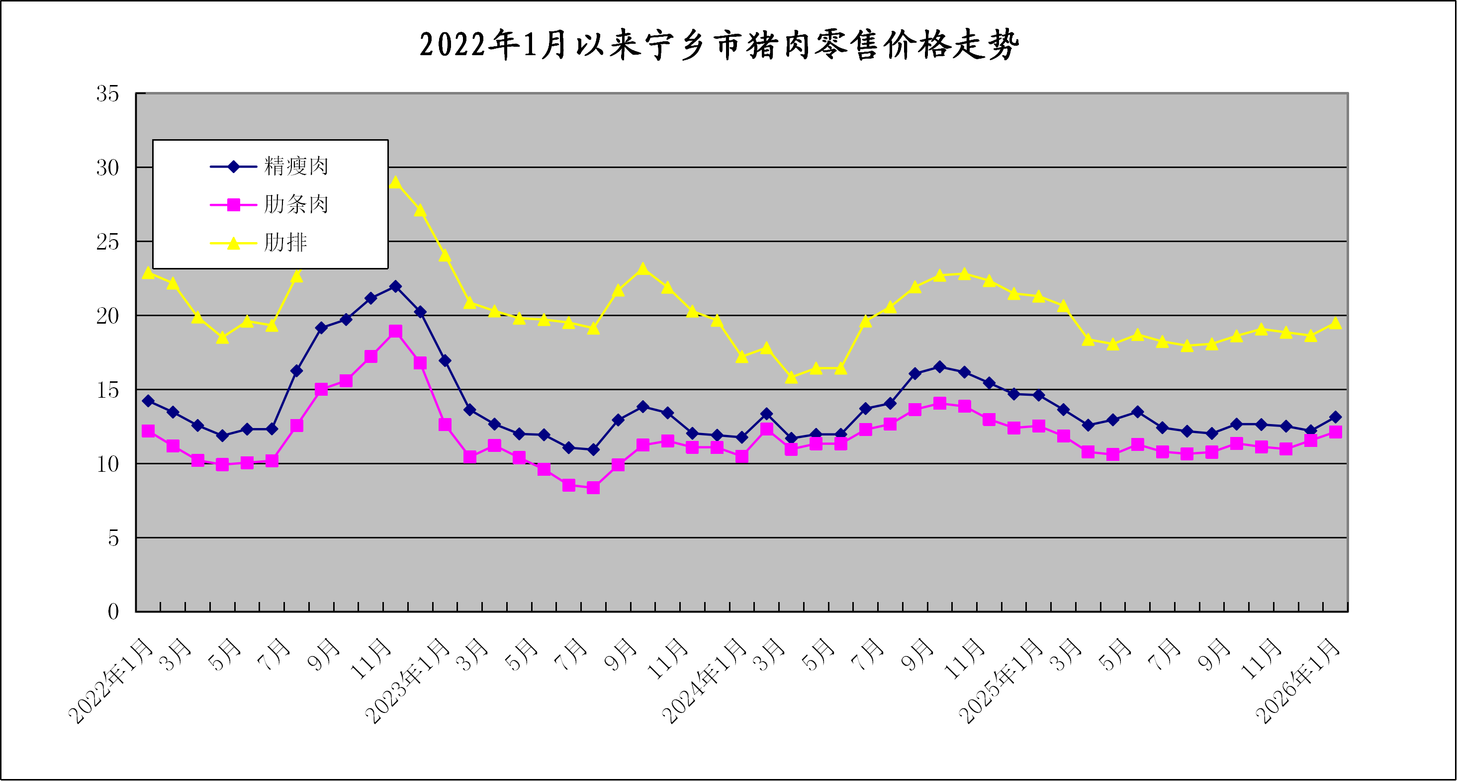 根據市場價格監測數據對比分析:2026年1月,寧鄉市各類生活必需品供應充足,總體零售價格穩中上行。其中:生豬收購價格上漲較大;豬肉零售均價上漲;其他肉類零售均價全線上漲;雞蛋零售均價上漲明顯;水果類零售均價穩中上漲;蔬菜類零售均價穩中小幅上漲;水產類零售均價上行;糧油價格基本穩定。
