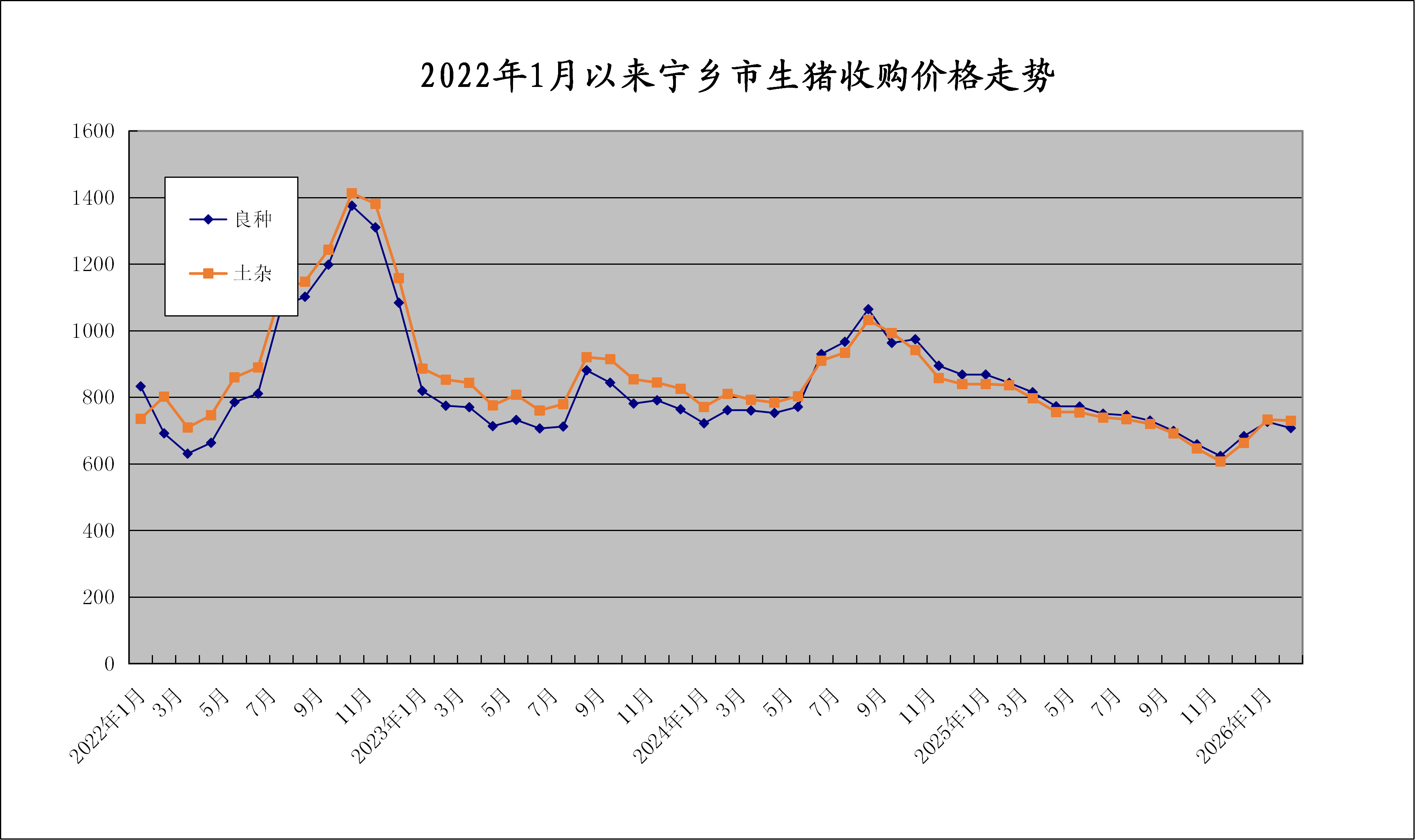 2025年12月21日(冬至)前后,寧鄉生豬價格開啟上漲通道,至2026年1月29日達到峰值15.31元/公斤,隨后于2月開始持續下跌,到3月5日已降至11.53元/公斤,豬糧比為4.56:1,季節性運行規律特征凸顯。節后價格回落的核心驅動在于需求端的快速萎縮:春節前居民家庭采購和餐飲消費旺盛,支撐豬價走高,但節后進入傳統消費淡季,需求大幅減少,疊加節前集中腌臘、灌腸等行為透支了部分后續購買力,進一步加劇了需求不足。從供應端看,節前養殖戶為保障市場供應普遍加快出欄節奏,節后生豬存量依然充足;隨著市場對短期價格預期轉弱,養殖戶出欄意愿增強,育肥達標生豬集中上市,使得市場流通量保持充裕,供應面整體寬松,共同推動豬價下行。監測數據顯示,本月,土雜三元大豬和良種三元大豬收購均價為每50公斤730.2元和707.8元,環比分別下跌0.41%和2.59%;母豬價格為每公斤28.48元,環比持平;土雜仔豬和良種仔豬收購均價為每公斤23.75元和25.05元,環比分別上漲9.45%和5.25%。